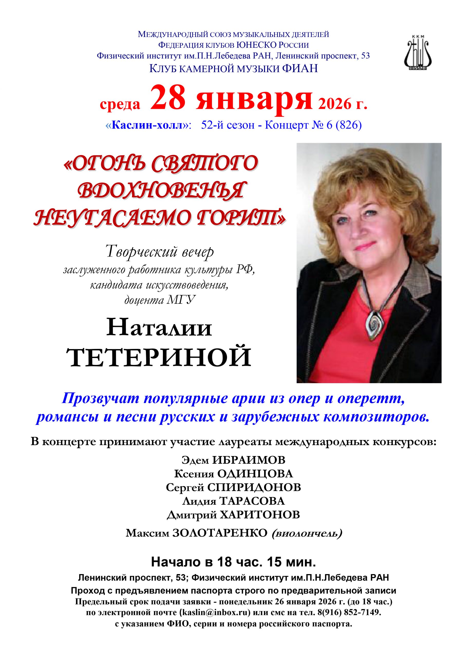 Приглашаем вас 28 января на творческий вечер заслуженного работника культуры РФ, кандидата искусствоведения, доцента МГУ Наталии ТЕТЕРИНОЙ. В исполнении замечательных солистов, которые многократно выступали в нашем клубе, прозвучат популярные арии из опер и оперетт, романсы и песни русских и зарубежных композиторов.